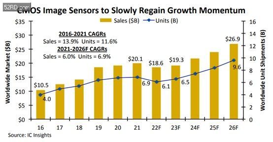 据IC Insights预测,2022年,全球CMOS图像传感器市场的销售额将下降7%至186亿美元,出货量将下降11%至61亿颗。